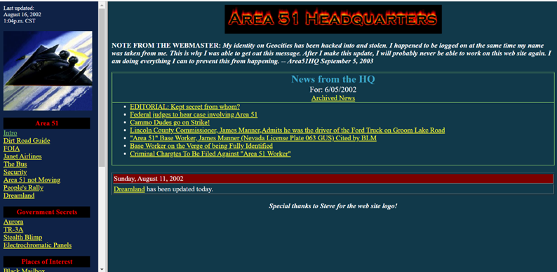 The Area 51 website shows the most innocent and possibly most valuable side of the internet. It is a community created to share opinions about Area 51 and government conspiracies with those who want connection to other people. No one on the website is getting paid so there is no motivation of greed or concern for who is making the money. I like how the website is edited by the owner rather than written, for it allows for other experiences to be shared so users feel more involved and connected. Although GeoCities looks like the greedy corporate in this scenario, all the positive aspects of the websites would not be possible without them. They make money off ads but there needs to be some type of income to continue to provide these resources so more creators can share their interests and projects.