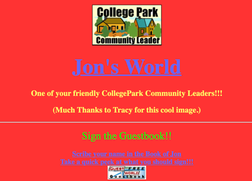 I will be looking at a webpage called Jon’s World in the CollegePark neighborhood. Notably, this website was not designated a suburb, but the creator of the website, who will be referred to here as Jon, was a community leader of the CollegePark neighborhood up until February 1999 but not from October 1999 onwards. CollegePark was a neighborhood that was made for all websites that were related to college: there were websites about applying to college, accounts of college experiences, or websites made by and about college students themselves like Jon’s World.
