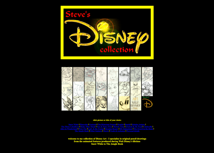 Within my blog, I chose to look through a Geocities gallery created through the restorativland project. After scrolling through the numerous Geocities sites varying in different topics, I eventually came across one that caught my attention. The name of the webpage is “Steve’s Disney collection.” As someone who enjoys watching Disney movies, I immediately clicked on this Geocities website to learn more about it. After clicking on the website, I was greeted by a page with a black background, a beautifully-made image for the title, several blue links, yellow text, and, most interestingly, an array of hand-drawn pictures. Since the webpage’s title was called “Steve’s Disney collection,” my initial thought was that the creator of the site was Steve and that Steve was the one who drew the drawings.