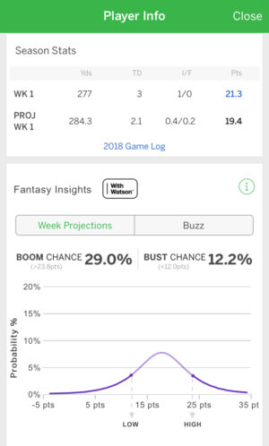 A feature that has been beneficial to Fantasy Football is the usage of artificial intelligence. What artificial intelligence does is give projections for the number of points each player will score each week before their game. These projections are based on matchups and past production. While the game is being played these projections constantly change based on how the player is doing. The way this is done is from the algorithms created by AI, which is supposed to help give users an advantage over their competitors. In the scholarly article “Deep Artificial Intelligence for Fantasy Football Language Understanding” by Aaron Baughman a group of researchers created different algorithms based on players’ tendencies from past seasons. The algorithms that they created ended up being helpful and informative about the different players’ projections.