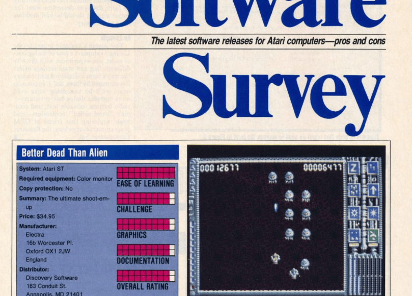 Link to Better Dead than Alien – Software Survey: https://archive.org/details/stx_Atari_Explorer_1989-01/page/n55/mode/1up?view=theater