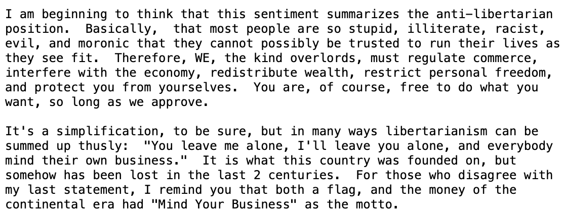 Diving into the topic of direct self-regulation for the group is a bit more tricky as there isn’t a specific set of rules that define what’s okay and what’s not okay. This extends further, due to the fact that during my research I couldn’t find a single discussion where someone was directly regulating the conversation in any way. The closest thing I found was someone calling another person’s beliefs stupid or moronic. This left me the ability to choose a discussion purely out of interest for the topic and so I landed on “Suppose you were fond of books”. This discussion is based on a short essay from Neil L. Smith titled “Suppose you were fond of books”. The essay uses an extended analogy to compare the regulation of guns to the regulation of books. There are a number of interesting points but also a number of places where it’s not hard to find errors in the reasoning. This makes the discussion extremely interesting and somewhat childish at times. The first responder in the thread argues against the essay’s point that books can influence people to kill other people by stating that when someone reads a book and decides they want to kill another person they need a gun to do so. Therefore taking away guns would greatly reduce books’ ability to influence murder. The next responder argues the difference between the violence potential of guns and books by comparing a paper cut to a hole in the head and describes the ideas discussed in the essay as moronic. The next responder simply states books promote ideas and that ideas are powerful. The last responder I’m gonna discuss absolutely explodes on anti-libertarian ideas. This is seen in the below picture.