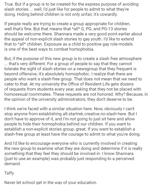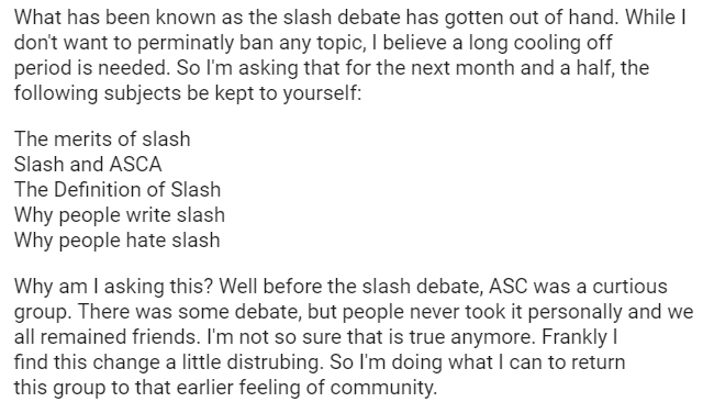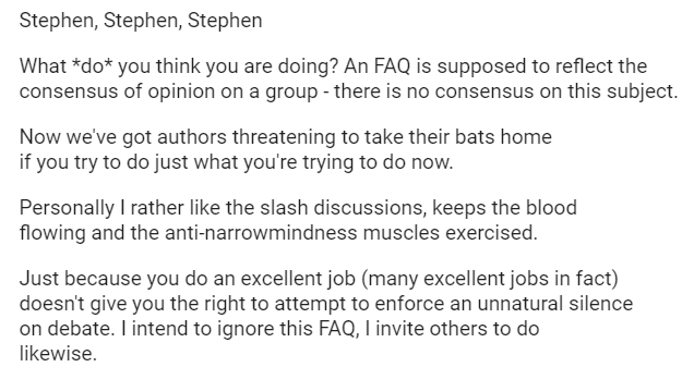 Here, Taffy makes an interesting comparison between online and in-person moderation: if real-life LGBTQ+ people and topics shouldn’t be banned or discriminated against, why should LGBTQ+ characters and themes be? This debate continued, until Stephen Ratliff, the ASC FAQ Maintainer, uploaded a post titled “FAQ Maintainer’s Notes: The Slash Debate,” which included the following message:
