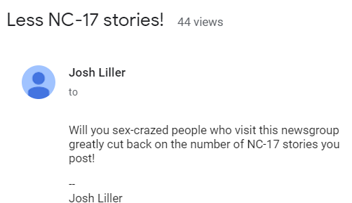 This complaint sparked a heated discussion of 82 varied responses. Many of these responses pushed back against the original poster—user Victor W. Wong accused them of being offensive and restrictive of free speech, while Joyce Harmon simply asked “Hey, who’s forcing you to read them?”—while others brought up similar concerns regarding the sexual nature of many of the fics being posted on ASC. User CmdrBevC wrote about fears of government censorship: “I WANTED to stay out of this…but those of you who want to keep the smut here don’t seem to see something vital: This is the type of stuff the government wishes it could censor. This is the type of literature that they do not want on the net.” User madmac wrote: “There *are* young people who visit this newsgroup. Kids don’t need to be reading this sex junk.” On the other side of the spectrum, user J wrote, sarcastically: