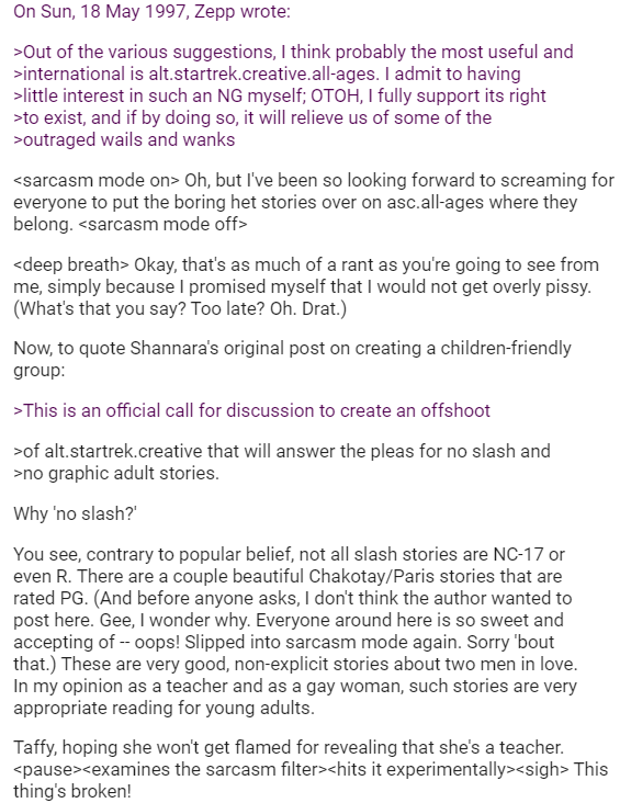 Thus, there seemed to be two main points of debate on ASC—whether or not NSFW and sexually explicit fanfiction should be allowed, and whether or not LGBTQ+ (gay or “slash”) pairings in stories should be allowed. The two discussions were often conflated; users would argue that slash fanfic should be prohibited because they were NSFW/explicit by nature, for example, even though slash/gay fanfic could be inherently non-sexual. This particular point is discussed (cheekily) by user Taffy, under a long thread on the formation of “alt.startrek.creative.pg-13,” aimed at creating a family-friendly group: