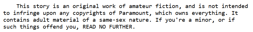 Despite the fact that the group was created for the purpose of sharing erotica, most ASCEM fics still included a general warning about the fic’s contents. They looked similar to this one: