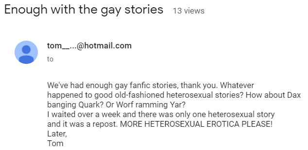 Others claimed to have religious reasons for not liking slash fic and not agreeing with it being posted on the group. Most of the responses, however, were staunchly for the inclusion of slash fics in the group. The aforementioned Ruth wrote, unswayed: “As long as I do it for love, I’ll write what I want to, which happens to be queer TrekSmut.”