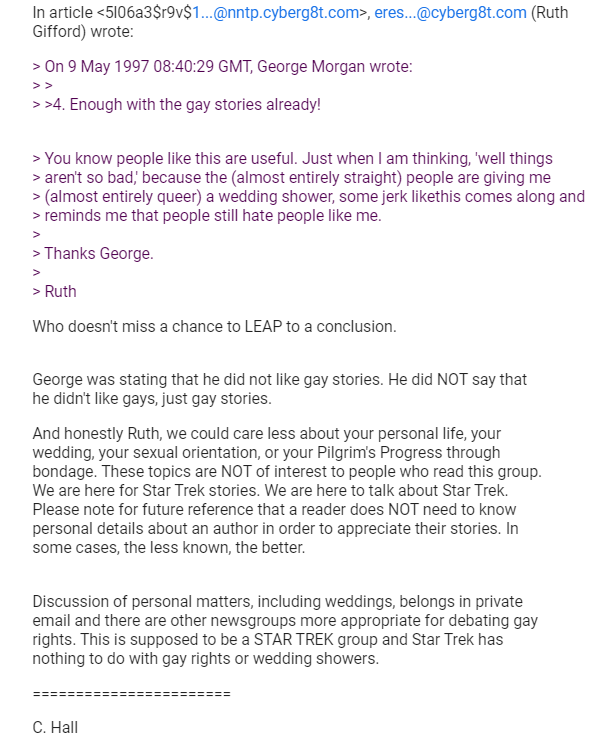 Soon, new discussions emerged regarding the contents of fic; this time, however, it was concerned with the sexuality of the characters depicted in relationships. On May 8, 1997, one user wrote: