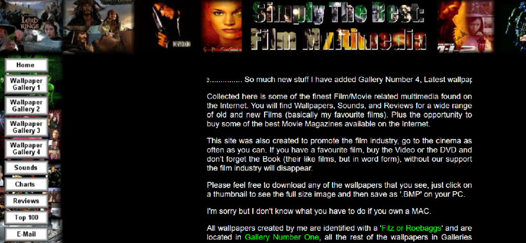 As a fan of movies, I decided to peruse the Hollywood neighborhood of GeoCities to find a website that interested me. It did not take too long for me to come across one that grabbed my attention. The person who designed and maintained this website, titled “Simply The Best: Film Multimedia” and with the URL https://geocities.restorativland.org/Hollywood/Movie/1985/, went by the username Roebaggs. Since the “Charts” subpage contains box office numbers almost entirely for the UK, and in British pounds, the author likely hailed from Britain. The last update to the website seems to have been in 2004, according to the copyright at the bottom of the home page, but much of the film-related content is from no later than the late 1990s and early 2000s. Other than these facts, no other information can be found about the site’s creator.