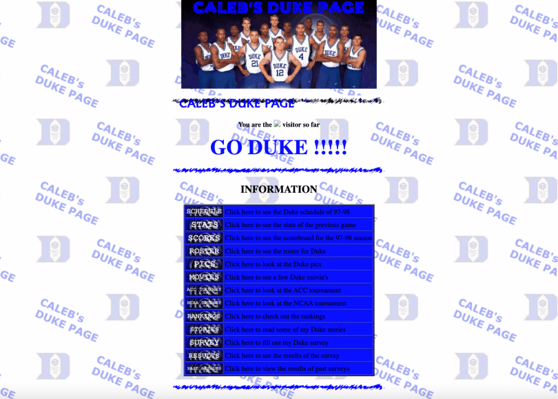 Consumption is another critical part to Geocities, as in the quote above we see how other people like Jenn want to create websites like this. The flashing blue lights and links to various other tabs regarding Duke basketball show how consumers wanted to create websites. Caleb’s intentions while creating this website was to reach a certain group of people: Duke students, alumni, NCAA basketball fans, blue blood program supporters, Durham residents, and even international basketball fans. Through the lens of one of these consumers, there are many interactive links that show identity, but incentives the consumer to stay on this particular geocitie. As mentioned above, the guestbook is a prime example of identity and consumption and the consumer is able to become a part of the community through signing the guestbook. Other aspects of the consumption are the links provided such as the Duke survey. These interactive features on the site are a way for the consumer to view the website in a different light compared to others. From past results to surveys regarding the team in previous years, to pictures of the team during games in the 1997-98 season, consumers have many ways to interact with this site. Ultimly, if one identifies with Duke basketball, then their identity will be represented in this website through various links that the consumer is able to use.