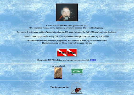 Aaron’s online identity is multifaceted. His site reflects his persona as a passionate diver who is eager to share his experiences and expertise. It even has a link to his email so that people can get in touch and connect about shared experiences or diving tips. The site’s personal tone and the inclusion of information about his dive equipment and dive buddies add depth to his online identity, suggesting a pretty personable and approachable demeanor. The website also lists his membership in the HTML Writers Guild, highlighting his affiliation with a broader online community, demonstrating a commitment to web development.