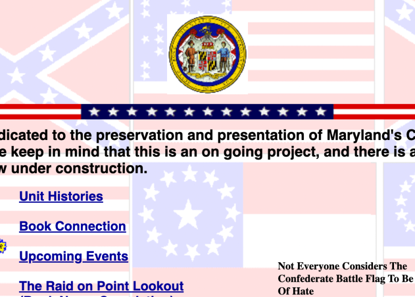 On opening the Geocities site ‘Stars and Bars’, one is greeted with a background collage of confederate flags through history. “Not Everyone Considers The Confederate Battle Flag To Be A Symbol Of Hate,” declares the opening page, above a picture of a black protestor carrying the confederate flag and sign reading “Heritage not Hate”. The welcome page paints a pretty good picture of its creator, historian and activist Gary B. Baker. Baker had founded the Association of Caroll’s Sacred Trust, dedicated to preserving Maryland’s history, a move that ultimately resulted in the production of Stars and Bars.