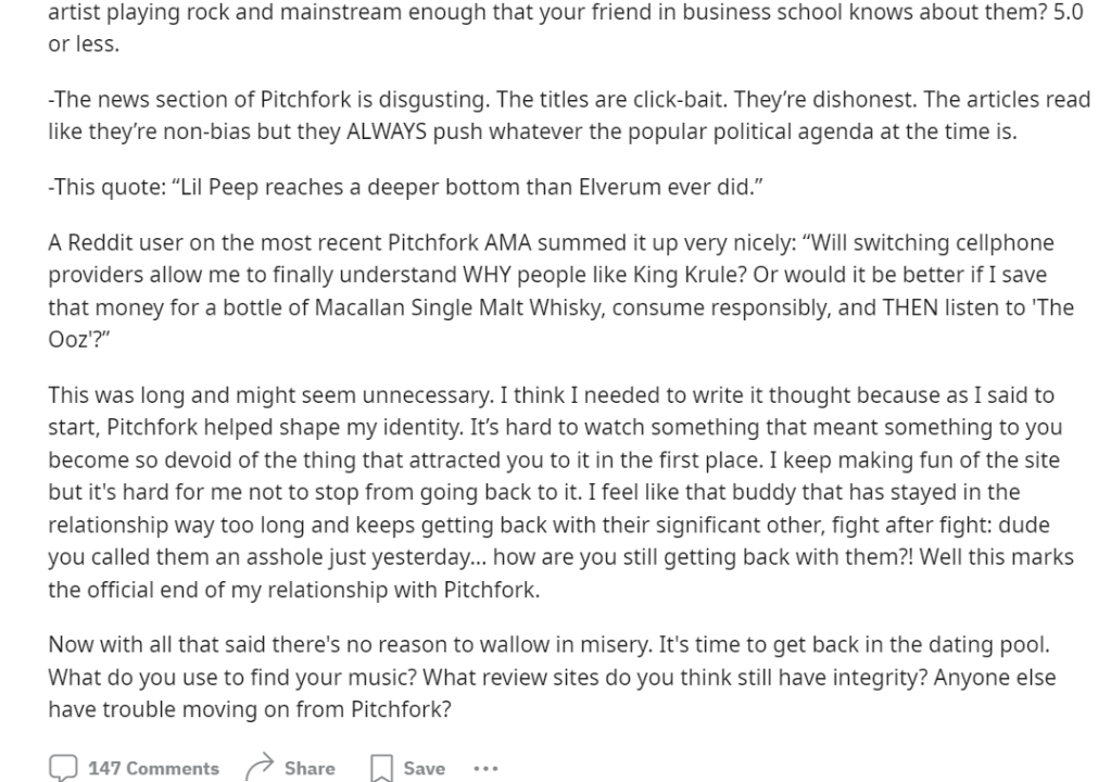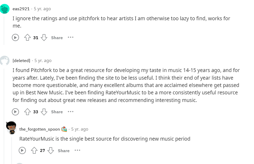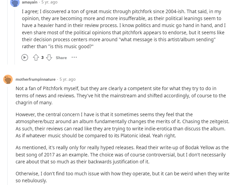 Pitchfork, however, should be different. The site is known for highlighting niche music but with the rise of streaming platforms, the site has become more inclined to give positive reviews to music that has the most streams. This created frustration within the Pitchfork fanbase, particularly, the old fans that have been following the site since 2006. This sentiment is exemplified in discussions among music enthusiasts, which are often found on platforms like Reddit. In the subreddit “Letstalkmusic,” a user with the handle f u/zenarcade3 discusses why they have stopped considering Pitchfork reviews, as shown in Figure 4. Other parts of the post have been excluded, but what is highlighted here are the reasons why this particular person has decided to stop reading Pitchfork reviews, after 30 years of being a devoted fan. The Redditor accuses the platform of dishonesty and of creating music reviews only for profit, highlighting that “Cardi B “Bodak Yellow” was Song of the Year in 2017. I don’t need to explain more. ”This shows the user’s frustration with the reviewing platform, and how they started giving good reviews to already well-known artists, which slowly dwindled their fanbase. As you delve more into the comments of many posts under “Letstalkmusic,” more and more previous users of Pitchfork also share the same sentiment. Another post made by u/NyarUnderground, shown in Figure 5, opens the discussion for users to talk about why Pitchfork is so wildly hated on their subreddit. Words like “insufferable,” “less useful,” “controversial,” and “hot garbage” are used to describe the site.