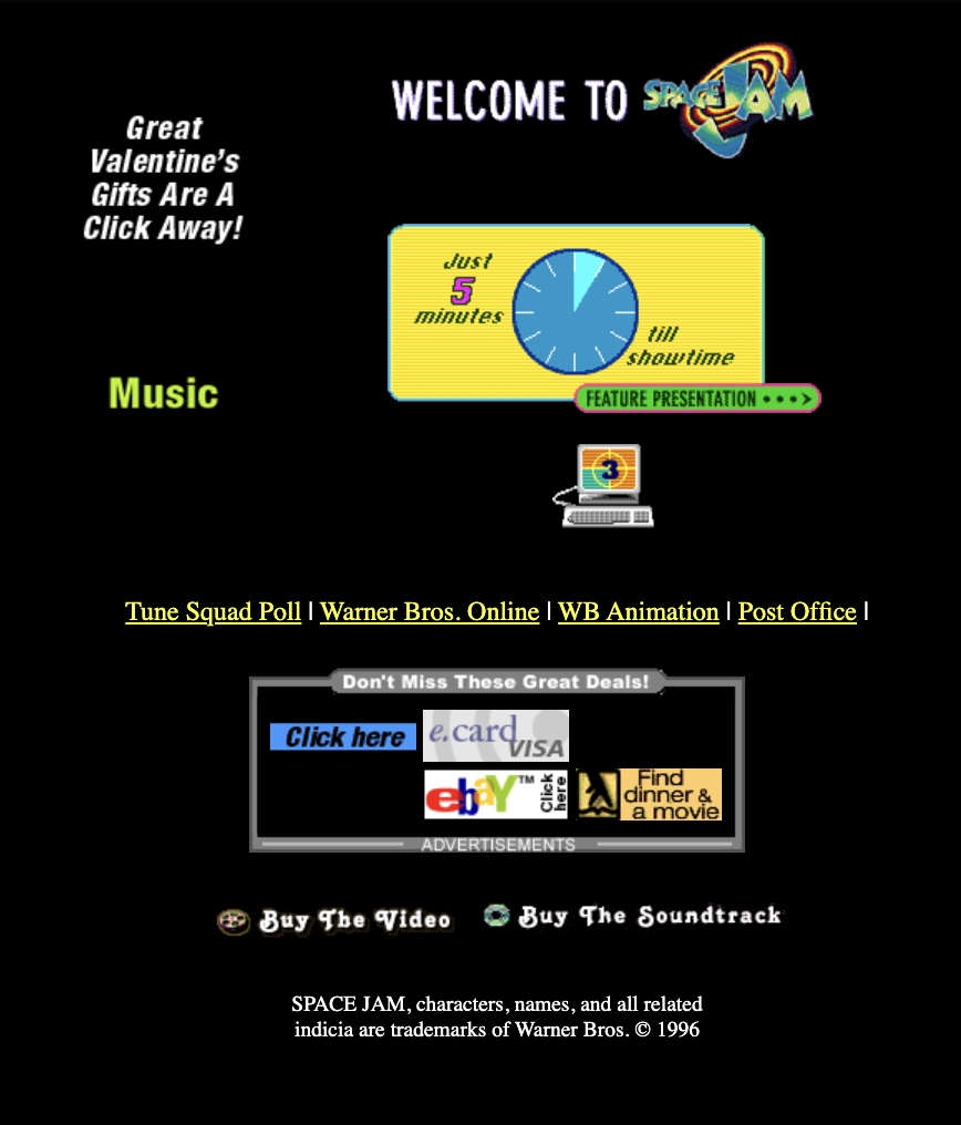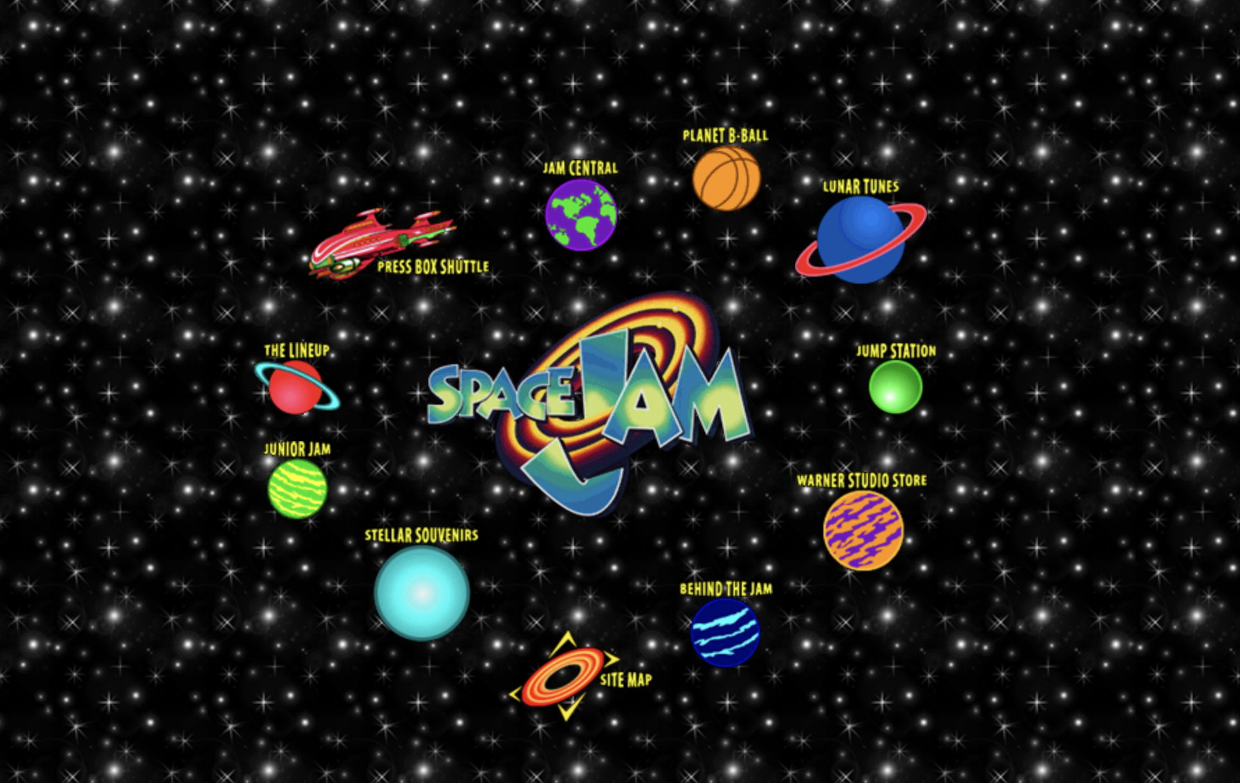 The 1996 Warner Brothers film, Space Jam, was an ambitious attempt to unite the biggest sports star in the world with Warner Brothers’ most popular animated franchise. In the live-action/animation production directed by Joe Pytka, basketball legend Michael Jordan starred alongside Bugs Bunny and the rest of the Looney Tunes squad. During the climax of the film, Jordan begrudgingly assists the Tune Squad in defeating the Monstars, a group of alien basketball players who steal the talent of five real-life NBA stars: Charles Barkley, Shawn Bradley, Patrick Ewing, Larry Johnson, and Muggsy Bogues. The movie released on November 15th, 1996 and made over $250 million at the box office, acting as the exemplary crossover between pop cultural nostalgia and sports celebrity fandom. Warner Brothers took advantage of this unprecedented collaboration by launching the film’s tandem promotional website SpaceJam.com on December 27, 1996. SpaceJam.com has shown exceptional resilience over the course of its 25-year lifespan by consistently adjusting to changes in technology and culture while maintaining links to its OG 1990s style influenced by the film it was designed to represent after.