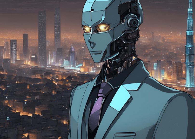 Cover image generated using Canva’s AI Image Generator using the prompt: Generate an image of a holographic, robotic figure in a suit in front of a darkened Cairo cityscape in an anime art style.