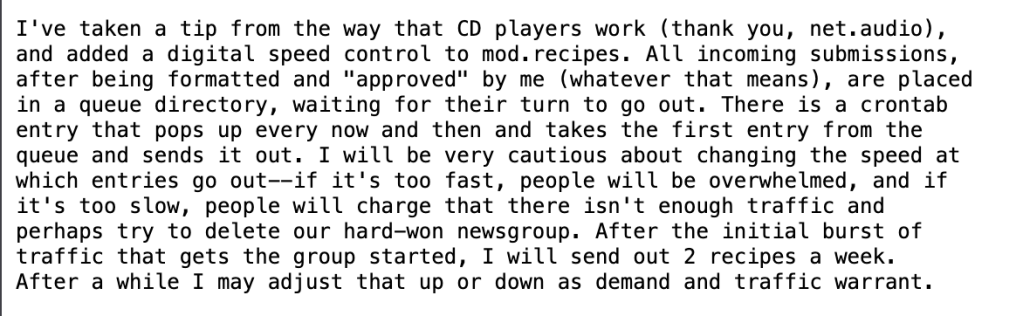 As the moderation became less consistent and frequent, the members of the newsgroup, new and old, to maintain its activity, started posting on their own with what can only be described as a high degree of self-moderation. Even though posts never stopped coming from reid@decwrl and recipes@decwrl, posts started popping up in late 1986 from other users simply sharing their recipes by themselves, which Reid either endorsed or never objected to. Additionally, around this time, they also started posting a cleartext, or easy-to-read, version of their recipes that made reading off of a computer more intuitive but did not have the same practical applications for printing or sharing the recipes across different software. Despite their new control, the users maintained the etiquette of not commenting on other’s posts, posting in the standard format, and staying focused on only sharing recipes, leading to the conclusion that after a certain point, the social convention of the newsgroup served to regulate what content was posted. Either out of anxiety over the backlash of disrupting the norm, or respect for the strict precedence, no one ever broke any of the rules that were initially laid out, at least not to the extent that the moderator, in his lackluster management, wasn’t able to moderate. The addition of the clear text, which initially came from a user, not the moderator, also displays that with less strict regulation, the newsgroup actually became more enjoyable to use, and overall, the shift away from strict, one-person moderation, may have yielded a nice reinvigoration of the forum.