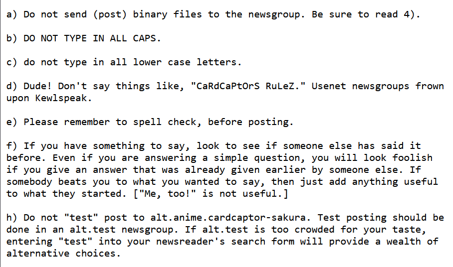 We can see that many items here describe requirements for writing with proper language rules. To avoid being “flamed,” one must use proper capitalization, perform spellcheck, and avoid coded slang languages like kewlspeak, which is a general name for a style of typing with such features as substituting the number “0” for the letter “o” like “d00d” instead of “dude” or text language commonly used today like “u,” “r,” and “lol.” In their messages, we can see that they try to speak formally, with proper grammar and sentence structures, like how people today write formal emails.