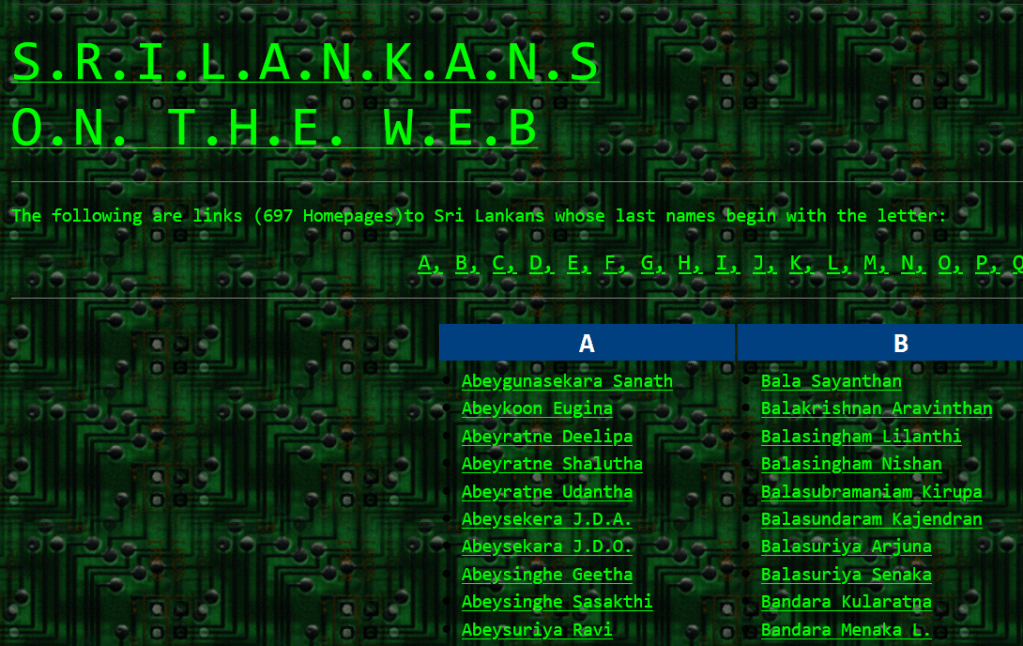 A quick google search leads me to a website called “Sri Lankans on the Web.” This website is a collection of 697 hyperlinks of Sri Lankans that takes me to their websites. While Siri’s website is inaccessible, Nipuna’s website link is the same link as the one I’m using. Muditha’s website is also inaccessible, but the link includes an “.edu” portion that clues me in on Muditha’s identity. He seems to be a student from Bowling Green State University from Ohio. I may be making assumptions, but it’s likely that all three of them are Sri Lankan students studying in America. Nipuna wanted to make a website and asked Siri and Muditha to help out with the Sri Lankan sub page.