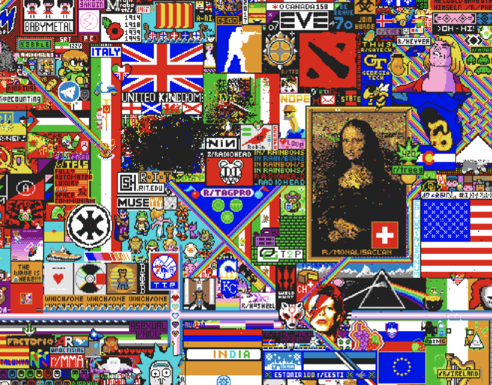r/Place is the subreddit that hosted the 2017 April Fools social experiment. On this subreddit, not only can users post and vote on posts, there also exists a 1000*1000 canvas (1 million pixels in total) where every user can change the color of a single pixel every 5-20 min. No other context was given: no instructions or goals. Yet, over the course of 3 days, over 1 million users changed over 16 million pixels, sabotaging and cooperating, eventually painting a beautiful collage of pixel art representing a multitude of internet culture and groups.