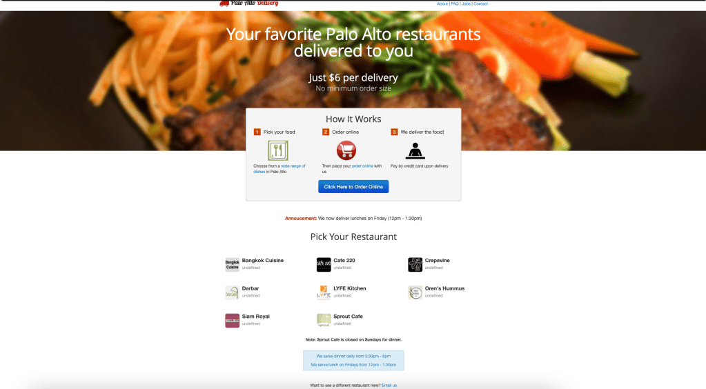 “Your Favorite Palo Alto Restaurants Delivered to You.” Palo Alto Food Delivery. Web Archive, May 2013. https://web.archive.org/web/20130517054730/http://www.paloaltodelivery.com/.