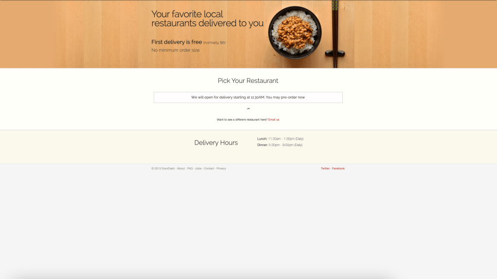 “Wayback Machine.” DoorDash Food Delivery | Bay Area Delivery. Web Archive, August 16, 2013. https://web.archive.org/web/20130816071348/https://www.doordash.com/.