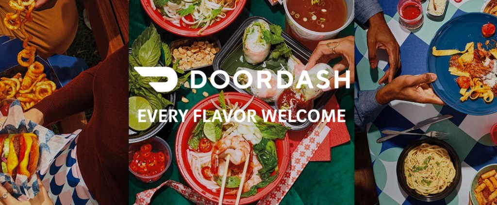 DoorDash Image Some visual examples of how DoorDash is advertised is like most other advertisments, where boards or posters are propped up somewhere with a large crowd to see, while other advertisments could be online and through social media. A way DoorDash advertises that ahs caught my attention before is when a sticker is posted somewhere near the door handle or hours of operation sign at a restaurant, as this image shows.