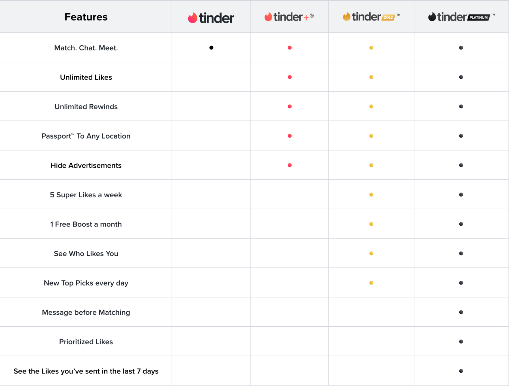 Tinder released its subscription service in 2015. Today, Tinder has 3 levels of subscriptions available for users.